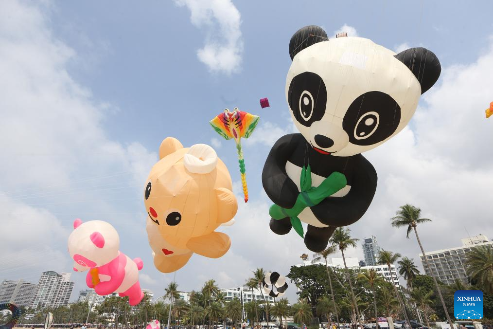 This photo taken on Feb. 25, 2026 shows kites flying above a beach in Pattaya, Thailand. Pattaya International Kite On The Beach 2026 kicked off here on Wednesday and will last until March 1. (Xinhua/Rachen Sageamsak)