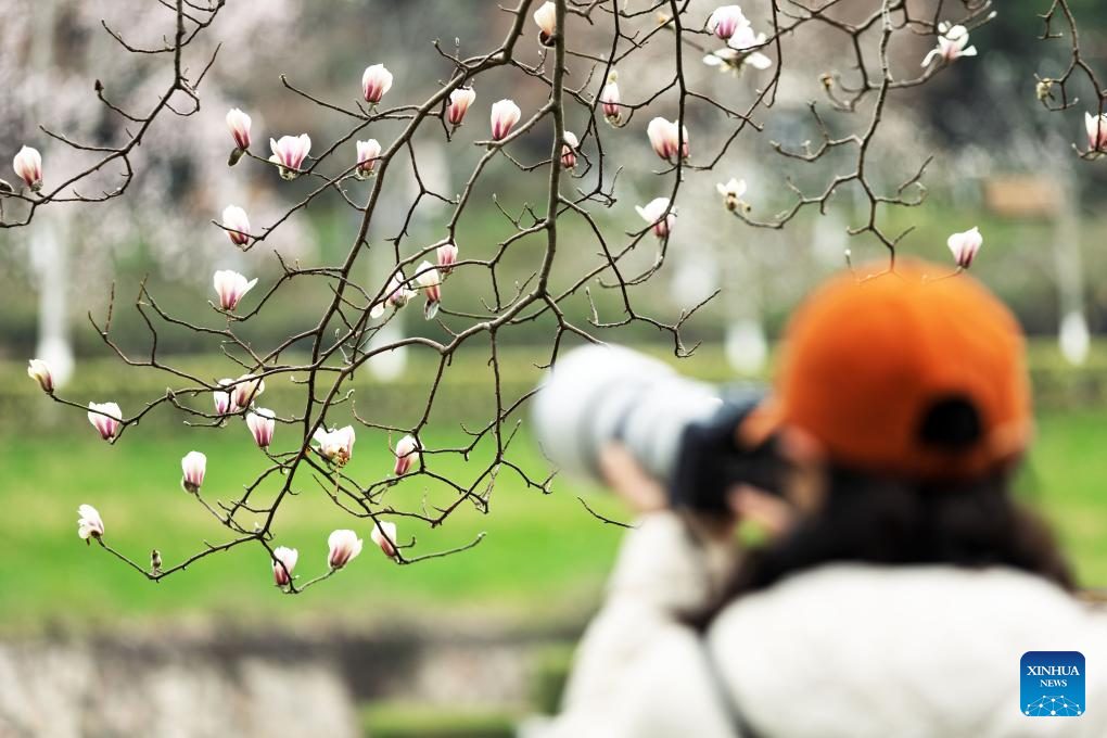 A tourist takes photos of magnolia flowers at the Yuhuatai scenic area in Nanjing, east China's Jiangsu Province, on Feb. 25, 2026. (Photo by Sun Zhongnan/Xinhua)