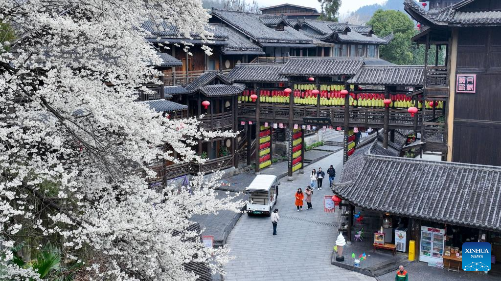 An aerial drone photo taken on Feb. 25, 2026 shows tourists visiting the Youzhou ancient town in Youyang Tujia and Miao Autonomous County, southwest China's Chongqing Municipality. (Photo by Qiu Hongbin/Xinhua)