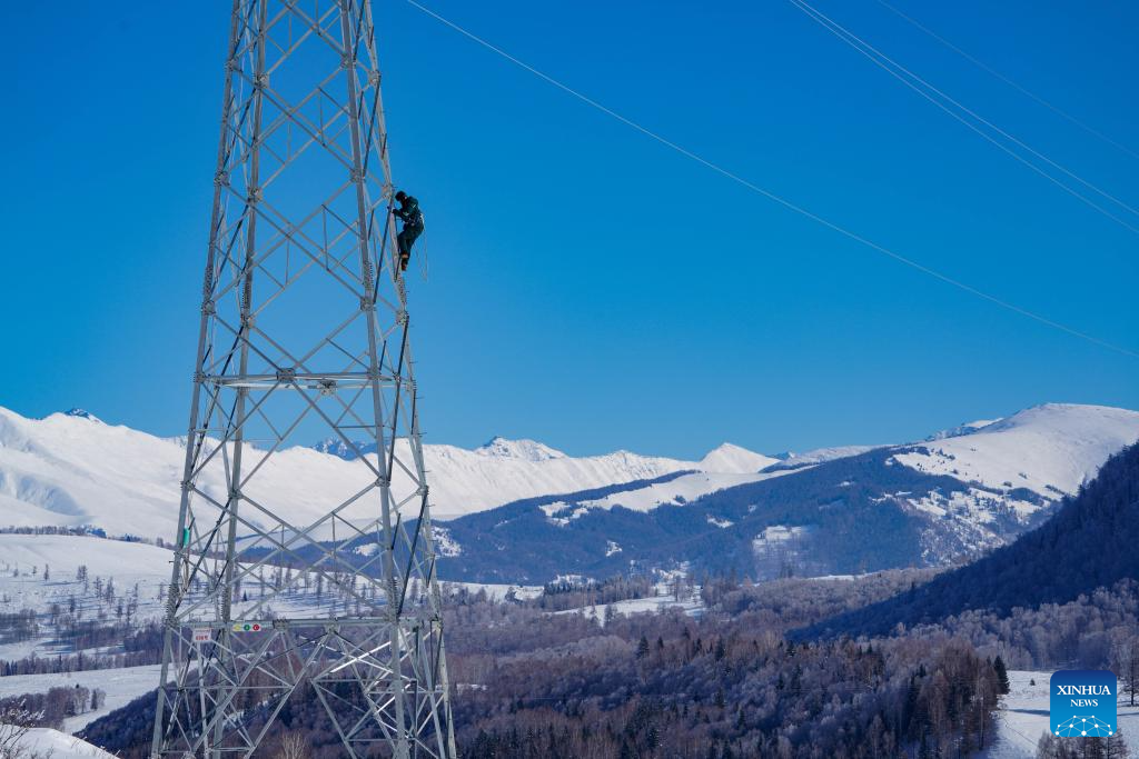 A maintenance worker operates on a transmission tower at Hemu Village of Altay, northwest China's Xinjiang Uygur Autonomous Region, Feb. 5, 2026.(Xinhua/Xu Hongyan)