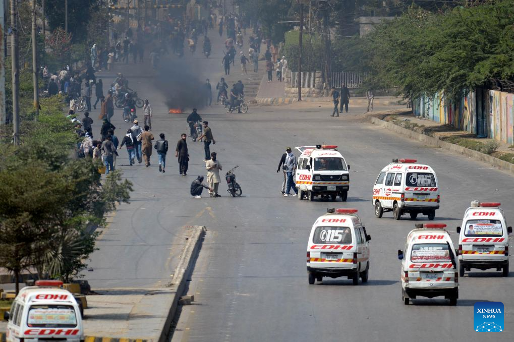 Ambulances are seen as protestors clash with law enforcement personnel near U.S. Consulate in southern Pakistani port city of Karachi on March 1, 2026. At least nine people were killed and more than 12 others injured on Sunday as angry protesters clashed with law enforcement personnel outside the U.S. Consulate in Karachi in the southern Sindh province, rescue officials said. (Photo by Imran Ali/Xinhua)