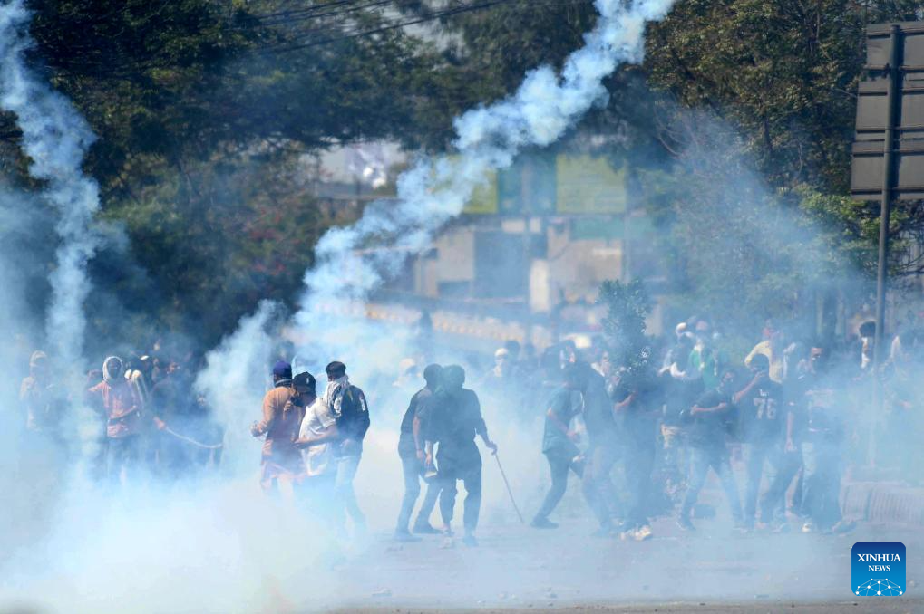 Protesters clash with law enforcement personnel near U.S. Consulate in southern Pakistani port city of Karachi on March 1, 2026. At least nine people were killed and more than 12 others injured on Sunday as angry protesters clashed with law enforcement personnel outside the U.S. Consulate in Karachi in the southern Sindh province, rescue officials said. (Photo by Imran Ali/Xinhua)