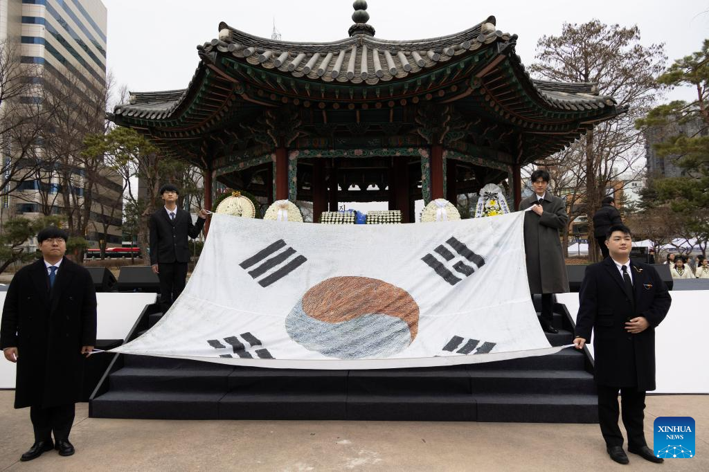 People attend an event marking the anniversary of the 1919 March 1 Independence Movement that took place during the 1910-45 Japanese colonization of the Korean Peninsula, in Seoul, South Korea, March 1, 2026. (Photo by Jun Hyosang/Xinhua)