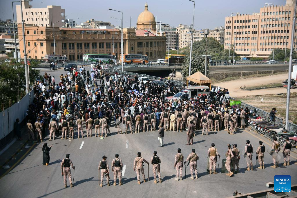 Law enforcement personnel (R) stand guard during clashes with anti-U.S. protesters near the U.S. Consulate in southern Pakistani port city of Karachi on March 1, 2026. Twenty people were killed and over 100 others injured in anti-U.S. demonstrations in Pakistan on Sunday, police sources told Xinhua. (Photo by Imran Ali/Xinhua)