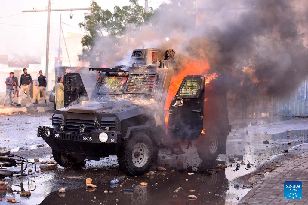A police vehicle is set on fire during clashes between anti-U.S. protesters and law enforcement personnel near the U.S. Consulate in southern Pakistani port city of Karachi on March 1, 2026. Twenty people were killed and over 100 others injured in anti-U.S. demonstrations in Pakistan on Sunday, police sources told Xinhua. (Photo by Imran Ali/Xinhua)