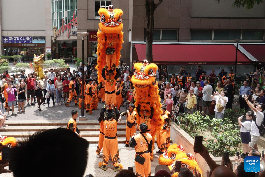 A lion dance is staged in celebration of the Lantern Festival in Singapore, March 3, 2026. (Photo by Then Chih Wey/Xinhua)