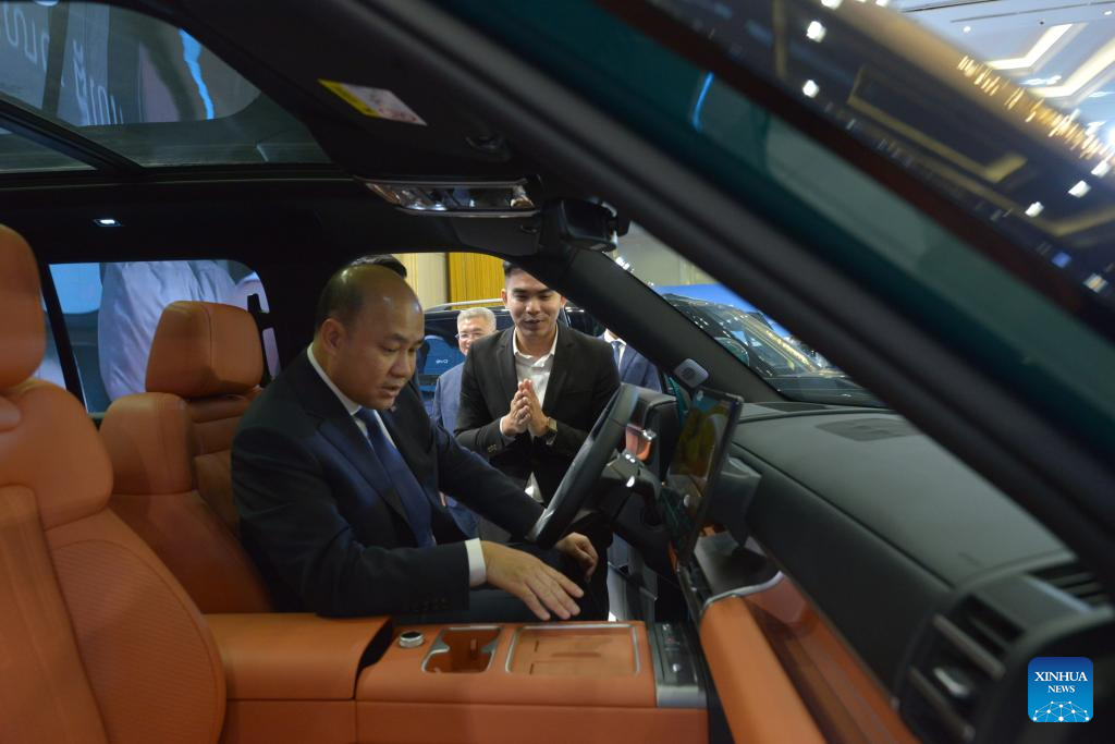 People visit an auto show in Phnom Penh, Cambodia on March 6, 2026. A number of Chinese auto brands such as BYD, Forthing, Changan, GAC and Jetour were on display at an auto show in the capital of Cambodia on Friday, attracting crowds of visitors. (Photo by Phearum/Xinhua)