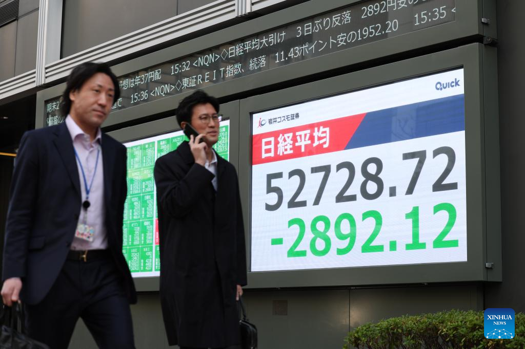 Pedestrians walk past a screen displaying stock market information in Tokyo, Japan, March 9, 2026. Japan's benchmark Nikkei stock index lost over 2,800 points on Monday, marking the third largest point drop in history. The 225-issue Nikkei Stock Average ended down 2,892.12 points, or 5.20 percent, from Friday at 52,728.72. (Xinhua/Yue Chenxing)