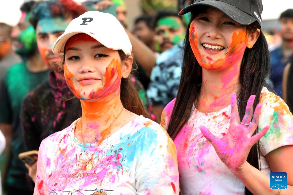 People smeared with colored powder pose for photos during the celebration of Holi festival in Pattaya, Thailand, March 13, 2026. (Xinhua/Rachen Sageamsak)