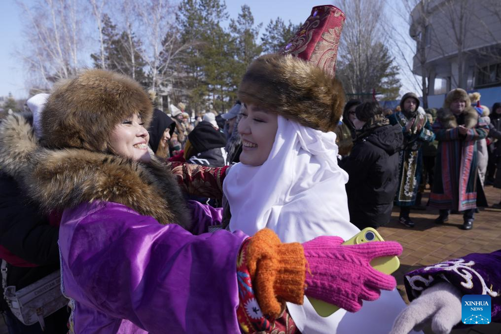 People greet each other during a Nauryz festival celebration in Astana, Kazakhstan, March 14, 2026. Regarded as the beginning of a New Year and one of the most important festivals in Central Asian countries, Nauryz (also known as Nowruz) marks the first day of spring. (Photo by Kalizhan Ospanov/Xinhua)