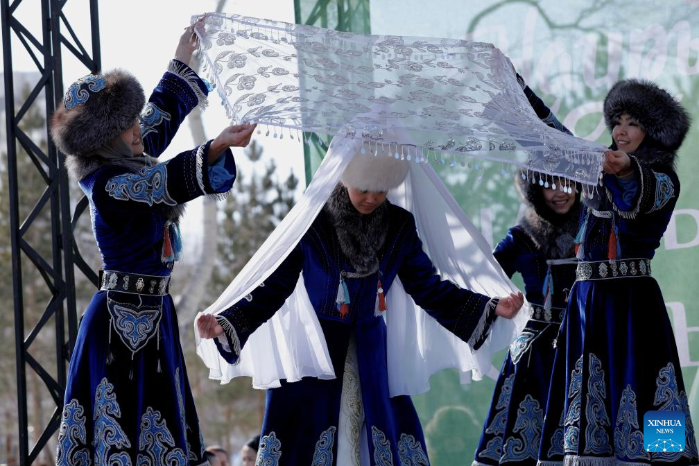 Actresses perform during a Nauryz festival celebration in Astana, Kazakhstan, March 14, 2026. Regarded as the beginning of a New Year and one of the most important festivals in Central Asian countries, Nauryz (also known as Nowruz) marks the first day of spring. (Photo by Kalizhan Ospanov/Xinhua)
