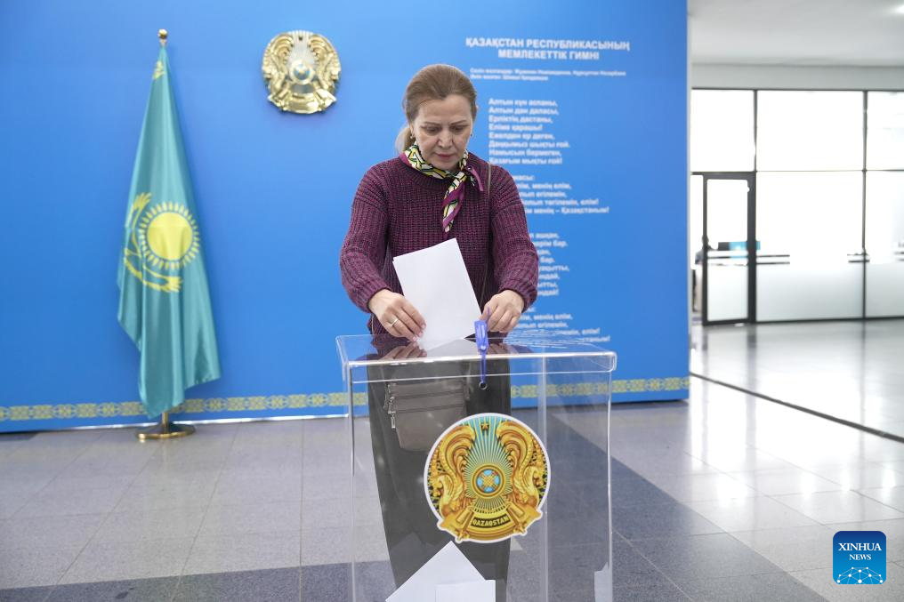 A woman casts a ballot at a polling station in Astana, Kazakhstan, March 15, 2026. Kazakh President Kassym-Jomart Tokayev on Tuesday signed the newly approved constitution, which will take effect on July 1 this year.