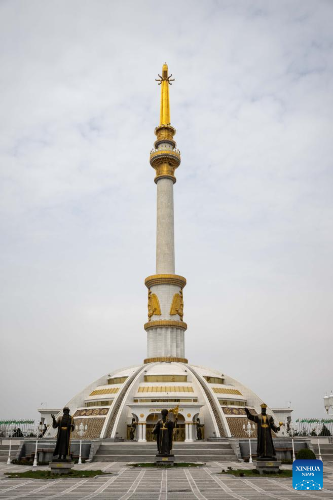 This photo taken on March 16, 2026 shows a view of the Independence Monument in Ashgabat, Turkmenistan. (Xinhua/Li Renzi)