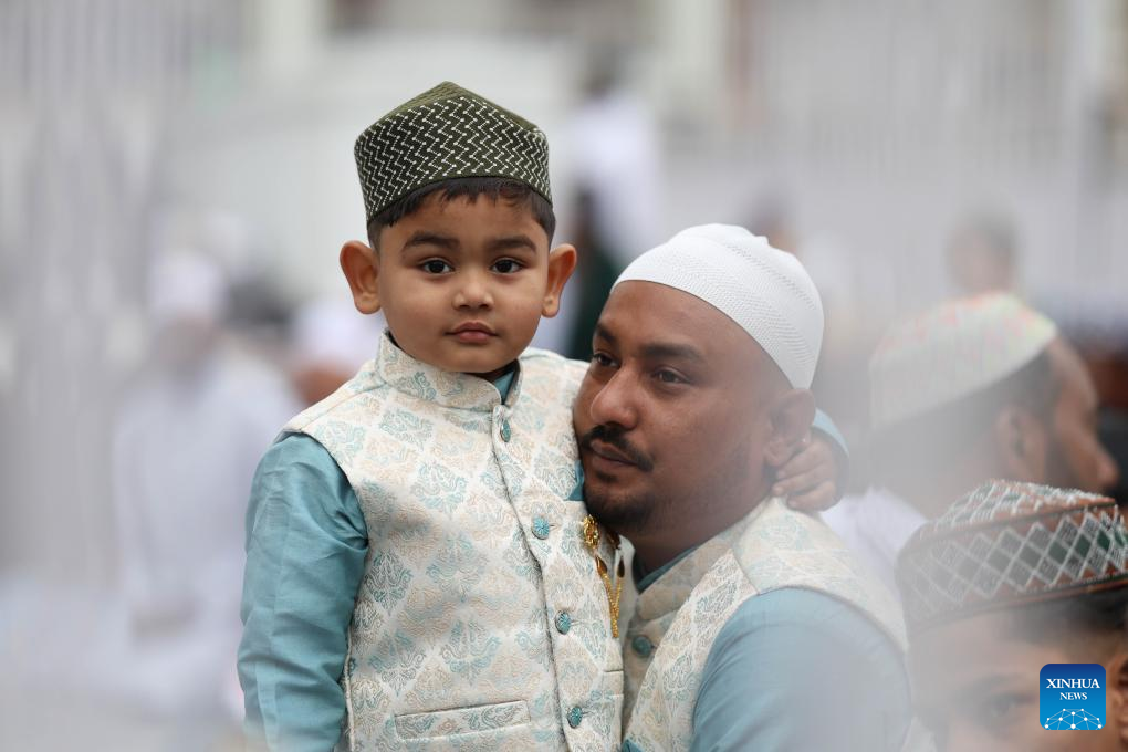 A devotee and a child are seen during Eid al-Fitr prayers at a mosque in Kathmandu, Nepal, March 21, 2026. (Photo by Sulav Shrestha/Xinhua)