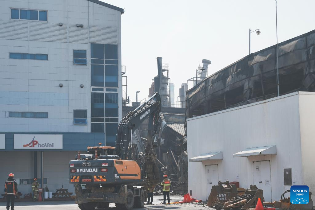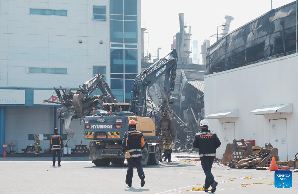 Rescuers work at the site of a fire that broke out at an auto parts manufacturing factory in Daejeon, South Korea, on March 21, 2026. (Xinhua/Zhang Can)