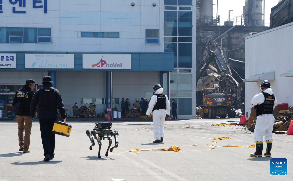 Rescuers and a robot dog are pictured at the site of a fire that broke out at an auto parts manufacturing factory in Daejeon, South Korea, on March 21, 2026. As of now, the fire has left 14 people dead, 59 injured, with all missing persons being found. Police said they have launched identification procedures for the victims and are focusing on determining the cause of the fire. (Xinhua/Zhu Hui)