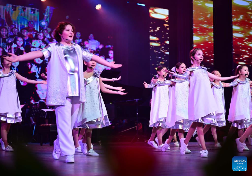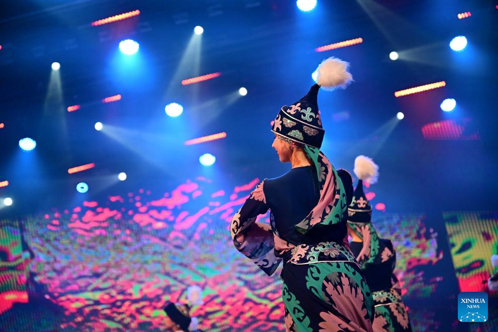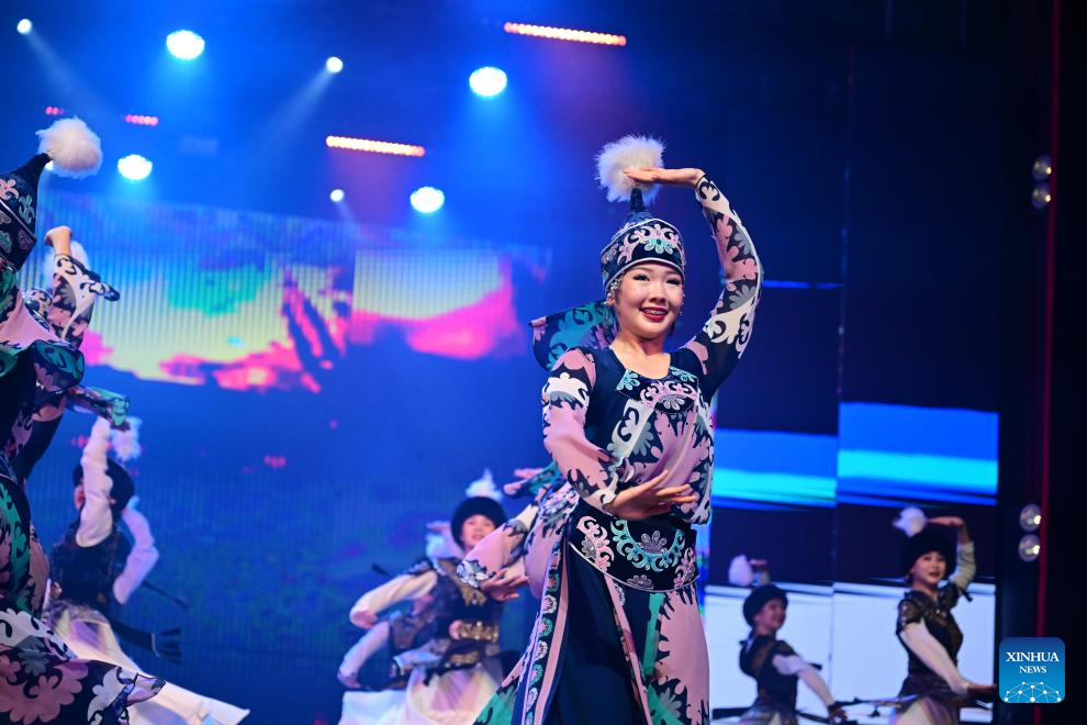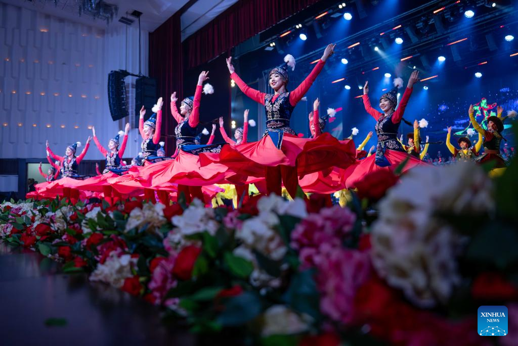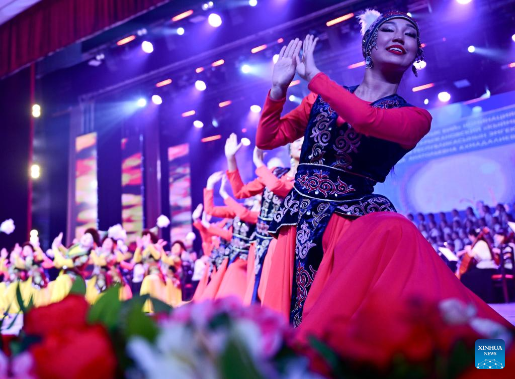 Performers dance during the opening ceremony of the first Youth Delphic Games of the Shanghai Cooperation Organization (SCO) member states in Bishkek, the capital of Kyrgyzstan, on March 24, 2026. The opening ceremony of the first Youth Delphic Games of the Shanghai Cooperation Organization (SCO) member states was held on Tuesday in Bishkek, attended by representatives of the arts from the 10 SCO member countries. (Xinhua/Li Renzi)