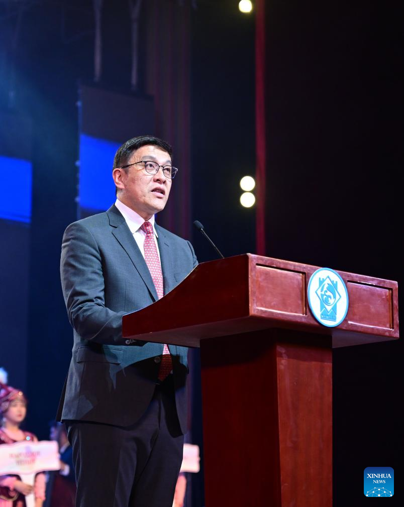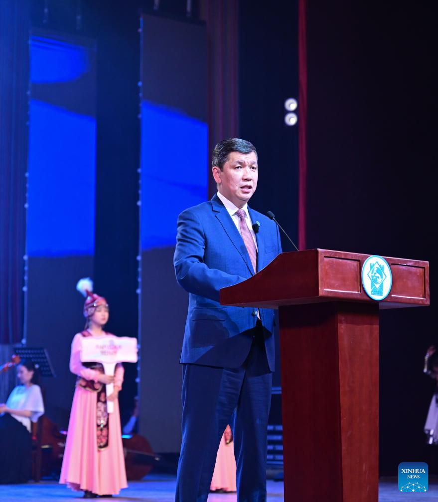 Bishkek Mayor Aibek Dzhunushaliev gives a speech at the opening ceremony of the first Youth Delphic Games of the Shanghai Cooperation Organization (SCO) member states in Bishkek, the capital of Kyrgyzstan, on March 24, 2026. The opening ceremony of the first Youth Delphic Games of the Shanghai Cooperation Organization (SCO) member states was held on Tuesday in Bishkek, attended by representatives of the arts from the 10 SCO member countries. (Xinhua/Li Renzi)