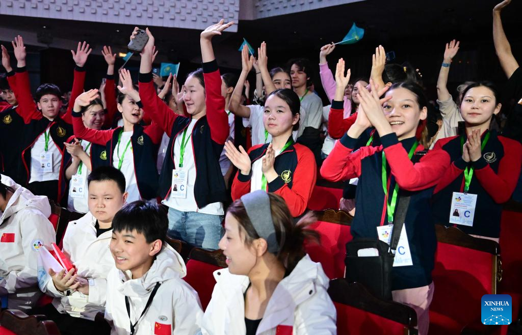 Members of the delegation of Kazakhstan attend the opening ceremony of the first Youth Delphic Games of the Shanghai Cooperation Organization (SCO) member states in Bishkek, the capital of Kyrgyzstan, on March 24, 2026. The opening ceremony of the first Youth Delphic Games of the Shanghai Cooperation Organization (SCO) member states was held on Tuesday in Bishkek, attended by representatives of the arts from the 10 SCO member countries. (Xinhua/Li Renzi)