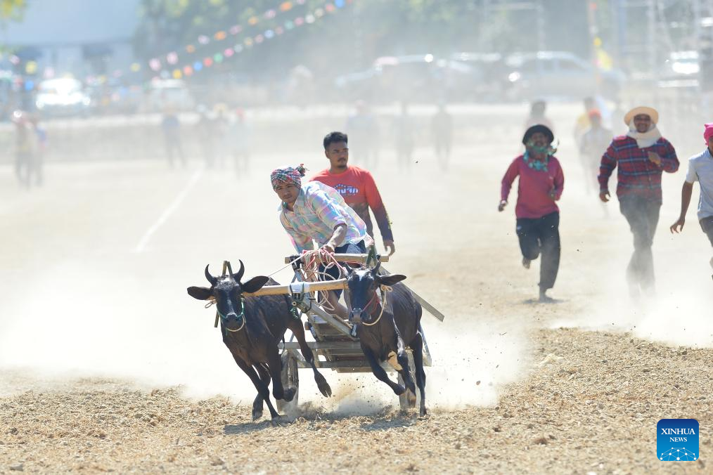 A contestant competes during an ox cart race in Phetchaburi Province, Thailand, on March 27, 2026. Ox cart racing is an annual event held in Phetchaburi to celebrate the end of harvest season. (Xinhua/Rachen Sageamsak)