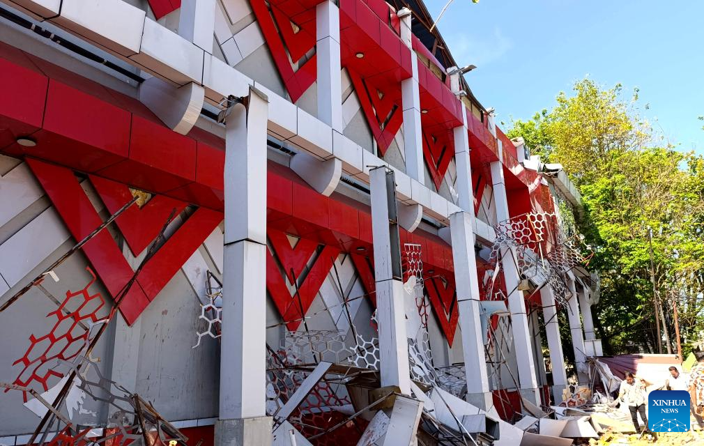 This photo taken on April 2, 2026 shows a damaged building in Manado, North Sulawesi, Indonesia. A woman was found dead after a powerful 7.6-magnitude earthquake struck the Maluku region of eastern Indonesia early Thursday morning, according to a local search and rescue team.