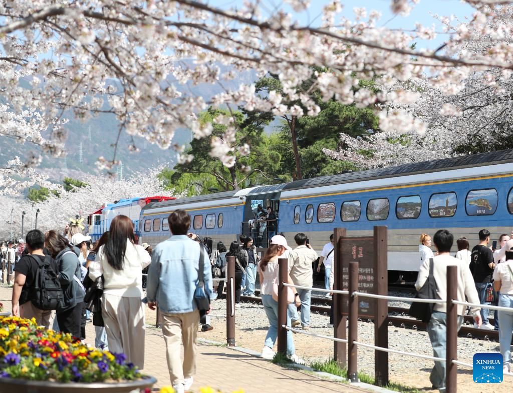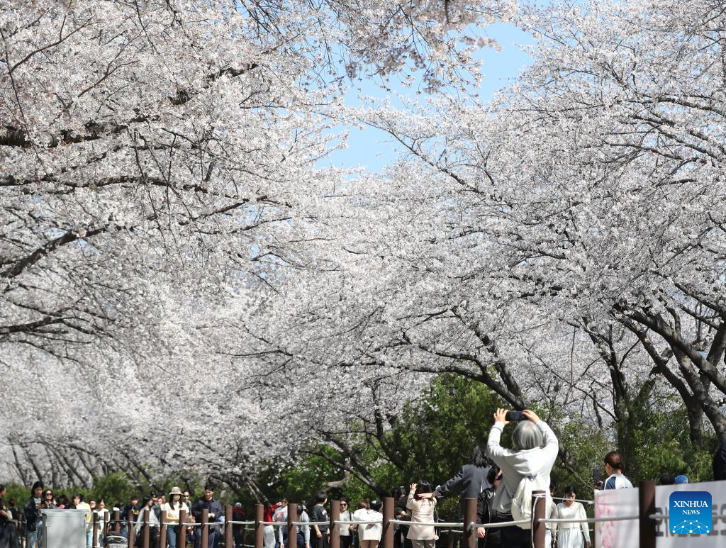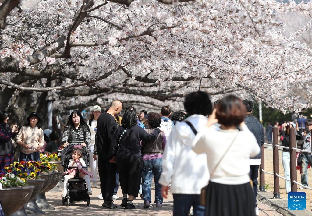 People enjoy the scenery of cherry blossoms in Jinhae-gu, Changwon City, South Korea, April 2, 2026. (Xinhua/Yao Qilin)