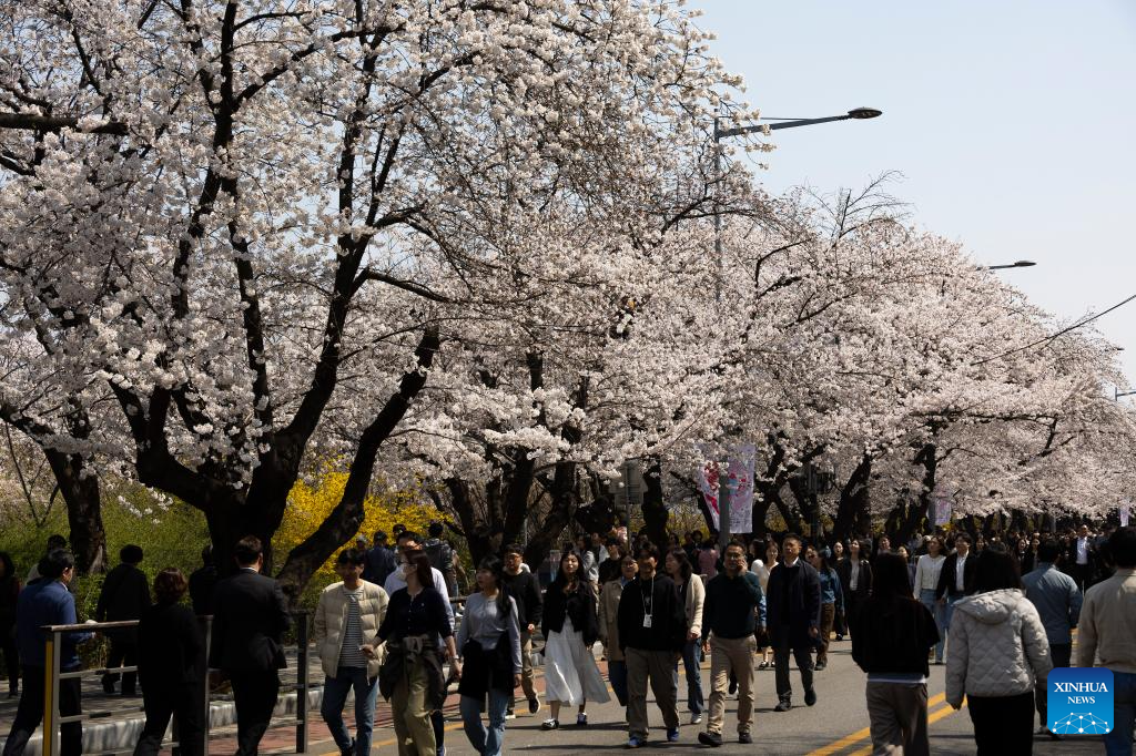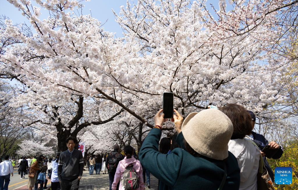 People enjoy the scenery of cherry blossoms in Seoul, South Korea, April 2, 2026. (Photo by Jun Hyosang/Xinhua)