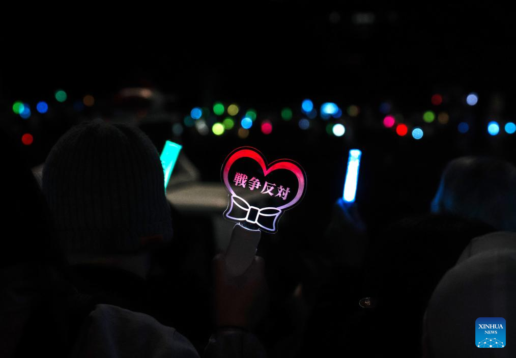 TOKYO, April 9 (Xinhua) -- A large crowd of Japanese people gathered outside the parliament building in Tokyo on Wednesday evening to protest government moves that undermine the country's pacifist constitution, including the deployment of long-range missiles and attempts to ease restrictions on lethal arms exports.