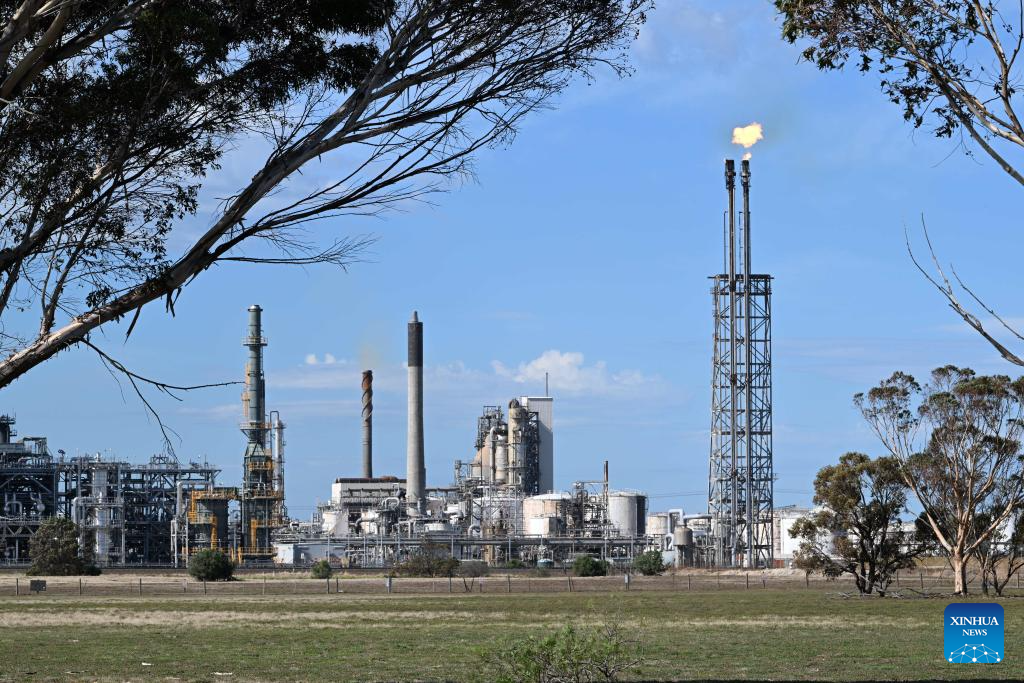 This photo taken on April 16, 2026 shows a view of Viva Energy's refinery in Geelong, Australia. Authorities said on Thursday that equipment failure caused a major fire at an Australian oil refinery on Wednesday night that is expected to affect the national fuel supply. The fire broke out at Viva Energy's refinery in the city of Geelong, 65 km southwest of Melbourne, around 11 p.m. local time on Wednesday and was continuing to burn on Thursday morning. (Xinhua/Xu Haijing)