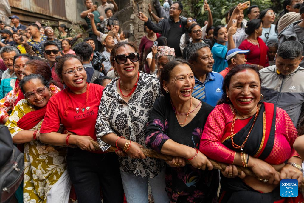 Women pull the chariot of Lord Bhairav during the celebrations of Bisket Jatra festival in Bhaktapur, Nepal, on April 16, 2026. The festival is celebrated to welcome the Nepalese New Year and the beginning of spring in Nepal. (Photo by Sulav Shrestha/Xinhua)