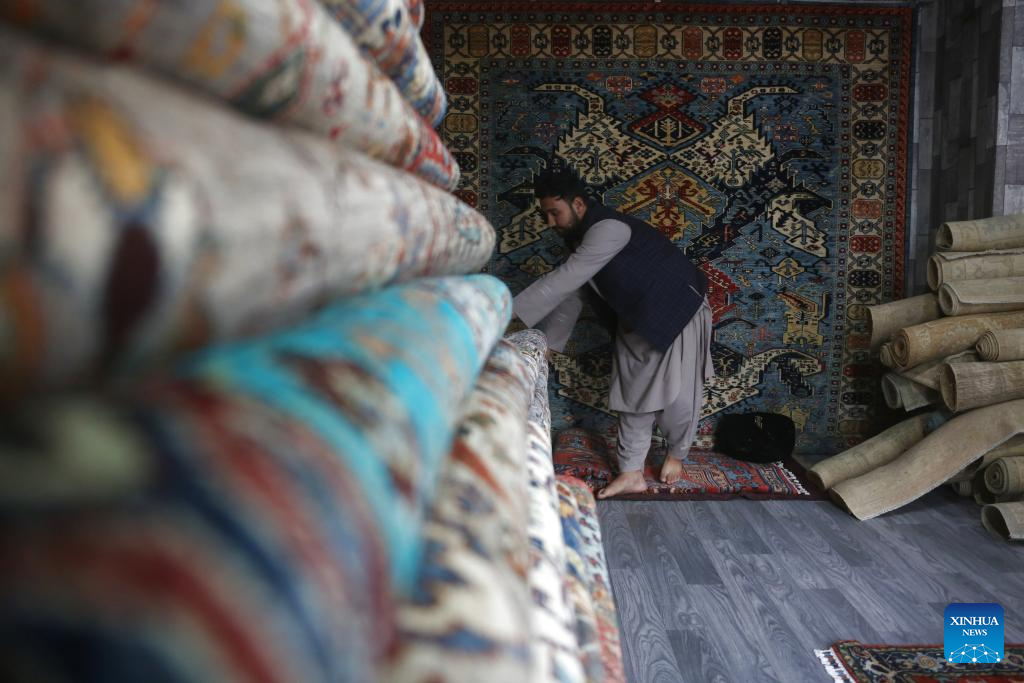 A salesman displays a carpet in Kabul, Afghanistan, April 18, 2026. Afghanistan exported carpets and rugs worth 18 million U.S. dollars over the past year, with shipments going to 37 countries, the official Bakhtar News Agency reported on Saturday. (Photo by Saifurahman Safi/Xinhua)