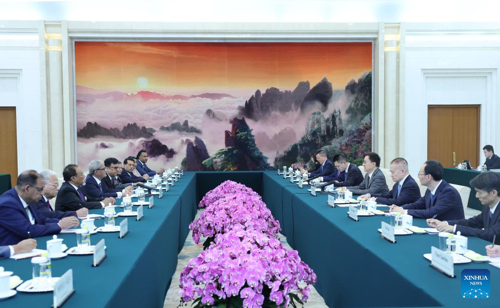 Chinese Vice President Han Zheng meets with a high-ranking cadre delegation of the Bangladesh Nationalist Party (BNP) led by Mirza Fakhrul Islam Alamgir, secretary-general of the Party and minister of local government, rural development and cooperatives, in Beijing, capital of China, April 21, 2026. (Xinhua/Yao Dawei)