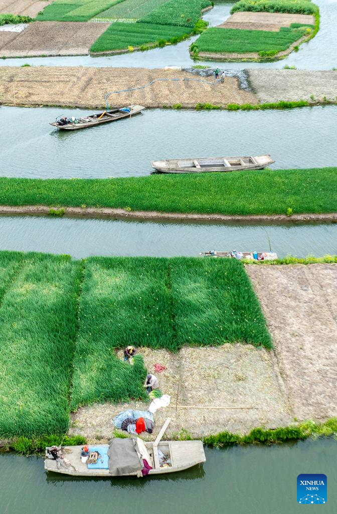 An aerial drone photo taken on April 20, 2026 shows farmers harvesting scallions in Duotian Subdistrict, Xinghua City, east China's Jiangsu Province.