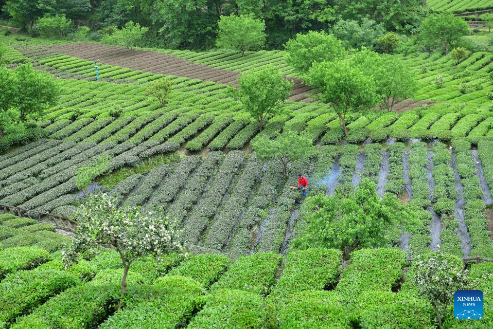A tea farmer works in an organic tea garden in Maoping Town, Zigui County, Yichang, central China's Hubei Province, April 20, 2026.
