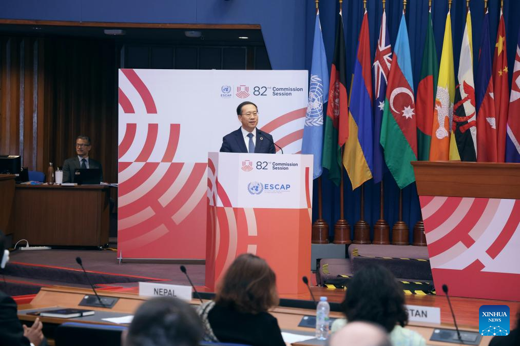 Chinese Vice Foreign Minister Ma Zhaoxu speaks at the 82nd session of the United Nations Economic and Social Commission for Asia and the Pacific (ESCAP) in Bangkok, Thailand, April 20, 2026. Global and regional leaders gathered here on Monday, calling for stronger action to ensure no one is left behind in a rapidly changing world. (Xinhua/Sun Weitong)