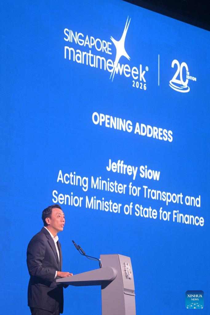 Singapore's Acting Minister for Transport and Senior Minister of State for Finance Jeffrey Siow addresses the opening ceremony of the Singapore Maritime Week (SMW) 2026 in Singapore on April 21, 2026. Singapore Maritime Week (SMW) 2026 runs from April 20 to 24 this year, bringing together more than 20,000 participants from nearly 80 countries and regions, including ministers, senior government officials, industry leaders and maritime professionals. (Photo by Then Chih Wey/Xinhua)