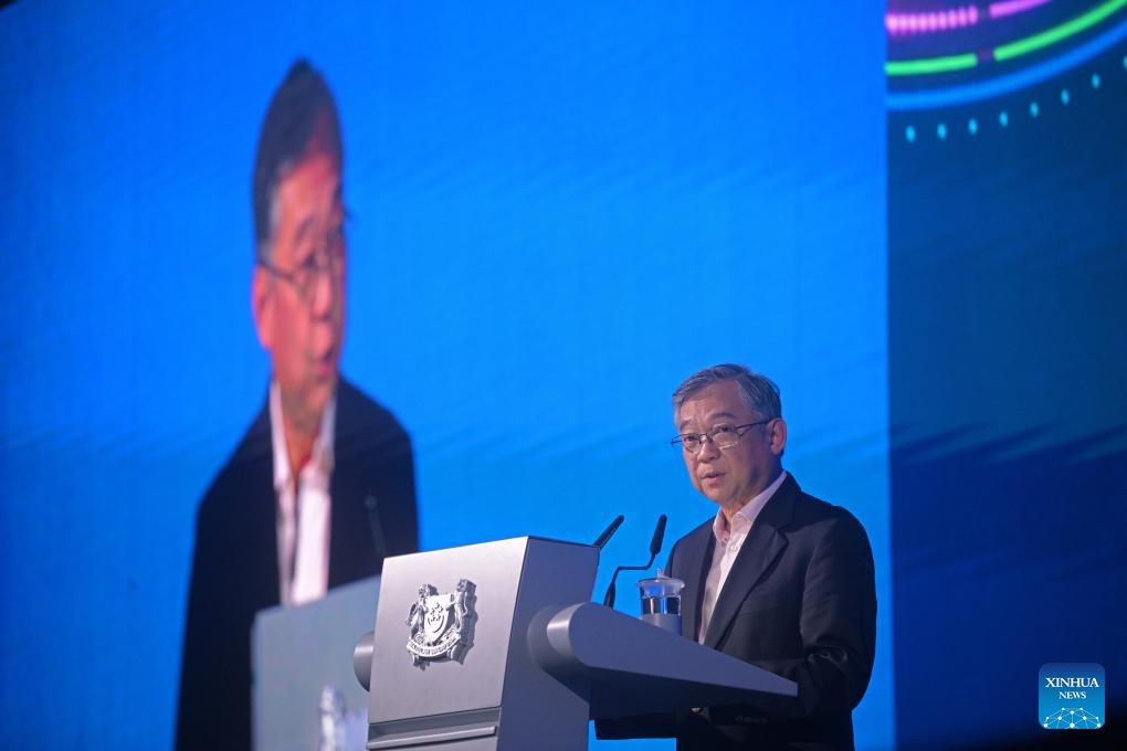Singapore's Deputy Prime Minister Gan Kim Yong delivers a speech at the Singapore Maritime Week (SMW) 2026 in Singapore on April 21, 2026. Singapore Maritime Week (SMW) 2026 runs from April 20 to 24 this year, bringing together more than 20,000 participants from nearly 80 countries and regions, including ministers, senior government officials, industry leaders and maritime professionals. (Photo by Then Chih Wey/Xinhua)