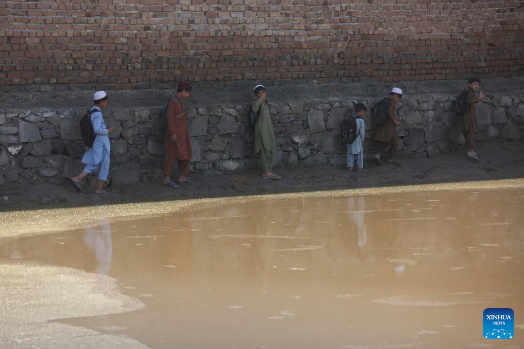 Kids walk by flooded areas in Nangarhar province, Afghanistan, April 13, 2026. (Photo by Saifurahman Safi/Xinhua)