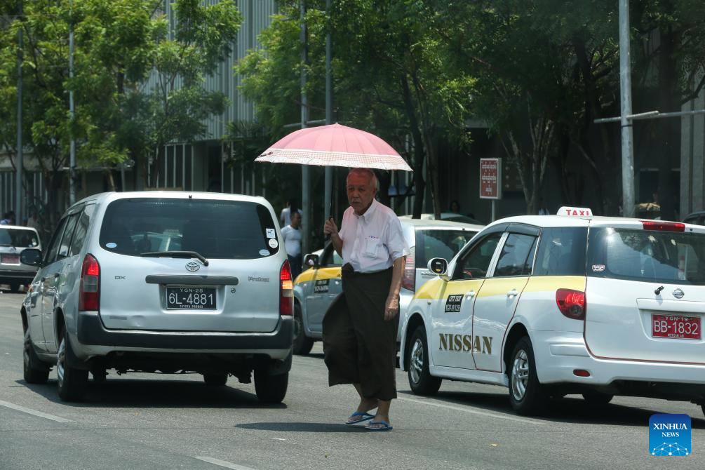 Pedestrians shield themselves from the sun with an umbrella in Yangon, Myanmar, April 22, 2026. (Xinhua/Myo Kyaw Soe)