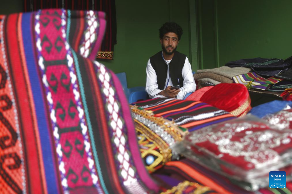 A vendor displays cloth during an exhibition showcasing agricultural, livestock and handicrafts products in Kabul, Afghanistan, April 22, 2026. (Photo by Saifurahman Safi/Xinhua)