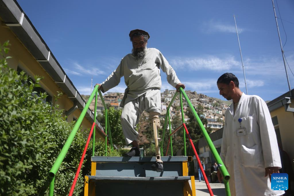 A handicapped man walks with a prosthetic leg at a rehabilitation center run by the International Committee of the Red Cross (ICRC) hospital in Kabul, Afghanistan, April 25, 2026. (Photo by Saifurahman Safi/Xinhua)