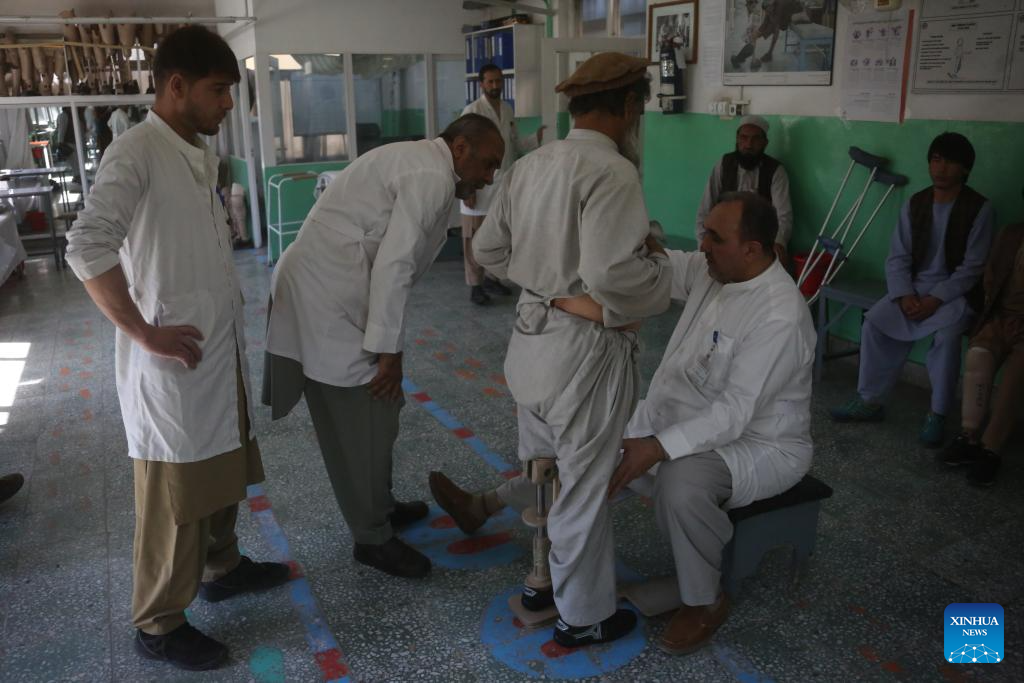 A health worker (1st R) checks a man with a prosthetic leg at a rehabilitation center run by the International Committee of the Red Cross (ICRC) hospital in Kabul, Afghanistan, April 25, 2026. (Photo by Saifurahman Safi/Xinhua)
