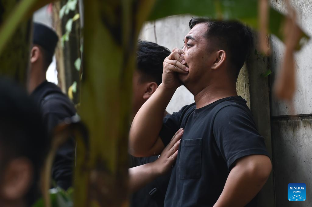 Relatives of passengers on the accident train wait for news at the train accident site in Bekasi, Indonesia, April 28, 2026. (Xinhua/Veri Sanovri)