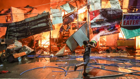 Huge fire engulfs shanties at slum area in Quezon City, the Philippines