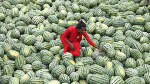 Workers unload watermelons from boats in Dhaka, Bangladesh