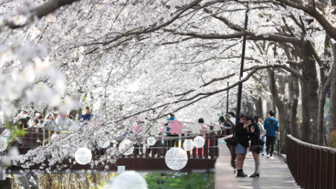 People enjoy scenery of cherry blossoms in Changwon City, South Korea