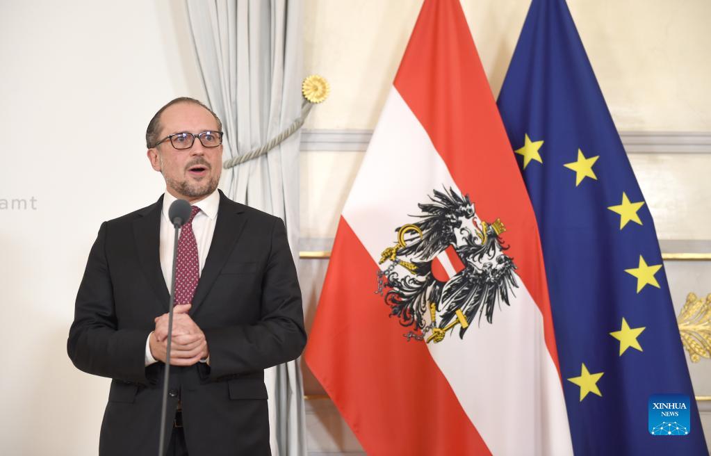Austria's former Chancellor Alexander Schallenberg gives a speech at the handover ceremony in Vienna, Austria, Dec. 6, 2021. The federal government of Austria was reshuffled on Monday and Karl Nehammer was sworn in as the country's new chancellor. (Xinhua/Guo Chen)
