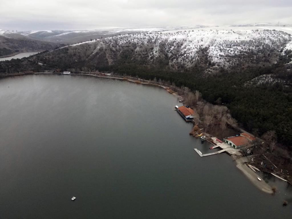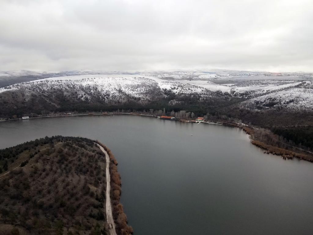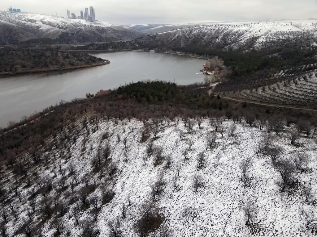 Aerial photo taken on Dec. 20, 2021 shows the winter landscape of Eymir Lake in Ankara, Turkey. (Photo by Mustafa Kaya/Xinhua)