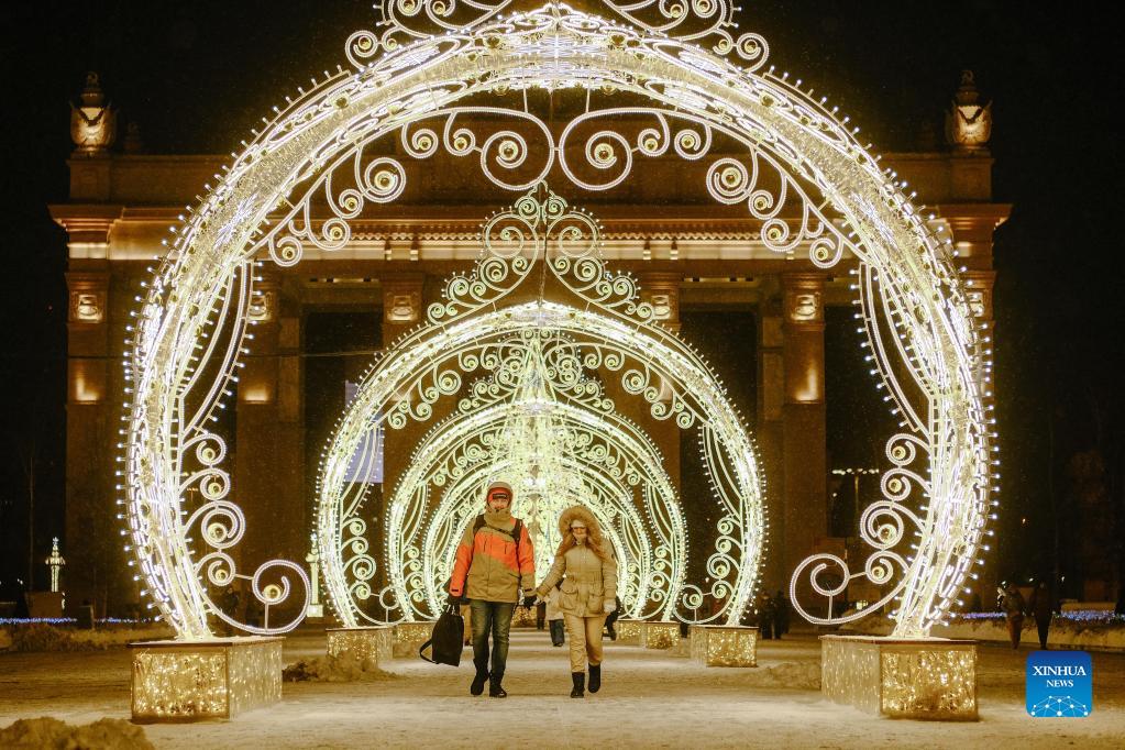 People walk through New Year decorations at VDNH (The Exhibition of Achievements of National Economy) in Moscow, Russia, on Dec. 21, 2021. (Xinhua/Evgeny Sinitsyn)