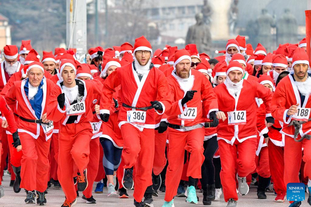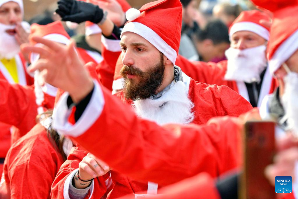 People dressed as Santa Claus take part in the annual city race in Skopje, North Macedonia on Dec. 26, 2021. (Photo by Tomislav Georgiev/Xinhua)